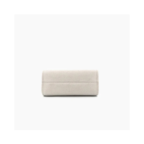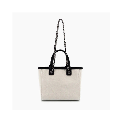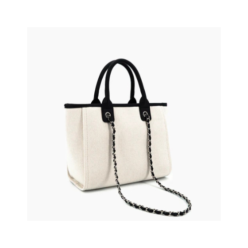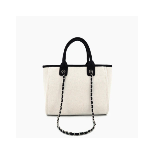 Material Contrast: The main body is constructed from durable, off-white Canvas or Twill Fabric, beautifully contrasted by smooth Black leather-like trim along the top edge and black short top handles.