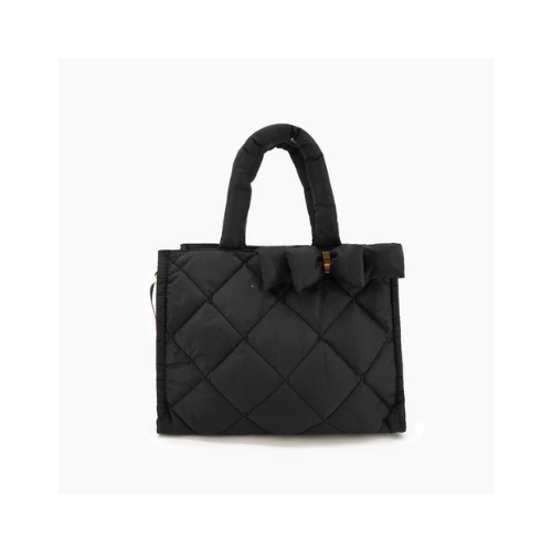 Material: Made from a lightweight, soft-touch Nylon or Quilted Puffer Fabric in a deep Black color. The material is durable and water-resistant.